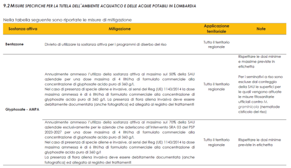- divieto di utilizzo della sostanza attiva Bentazone per le colture di riso e mais;
