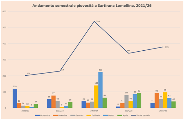 Si riporta l’andamento pluviometrico nell’ultimo semestre, riferito al periodo 2022/26, rilevato a Sartirana Lomellina.