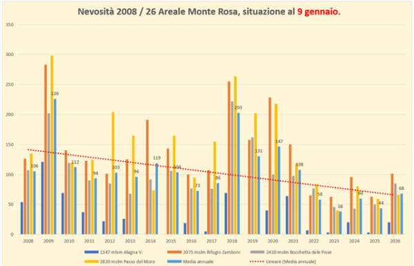 L’analisi delle riserve nevose delle 4 stazioni nivometriche posizionate nell’intorno del Monte Rosa evidenzia i ridotti accumuli nevosi presenti, dato purtroppo in linea con l’ultimo quinquennio. In particolare, rispetto all’ultimo ventennio, si misura il quinto peggior dato. Significativo è come gli ultimi 5 anni presentino, alla prima decade di gennaio, i 5 dati peggiori di accumulo.