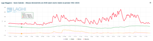 Il lago Maggiore ha un livello idrometrico nell’intorno dei 100 cm con un dato leggermente sopra media. Come già anticipato, inizia ad essere preoccupante lo scarso riempimento dei bacini elvetici del Canton Ticino.