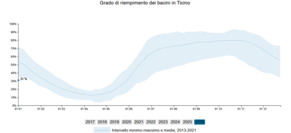 Preoccupa lo scarso riempimento dei bacini idroelettrici del Canton Ticino che sta segnando il minimo degli ultimi anni. Se le nevicate previste sul lato Nord delle Alpi Lepontine non saranno significativi, si potrebbe determinare il primo segnale di attenzione per la prossima stagione irrigua.
