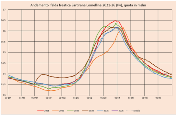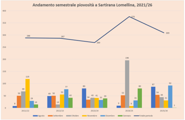 Si riporta l’andamento pluviometrico nell’ultimo semestre, riferito al periodo 2022/26 rilevato a Sartirana Lomellina, con un dato in linea con le precedenti annate. Le piogge di dicembre 2025 hanno dato un contributo alla falda freatica, qualora fosse stato accumulo nevoso come negli scorsi decenni, il contributo sarebbe stato considerevolmente superiore.