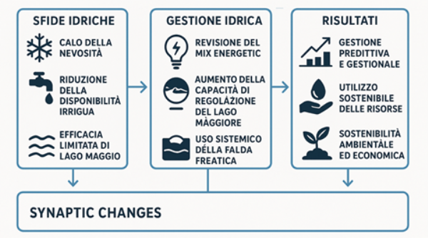 Attraverso l’analisi del parametro SWE (Snow Water Equivalent), si evidenzia un calo costante dell’accumulo nevoso, con conseguente riduzione della disponibilità irrigua nei mesi estivi. I serbatoi alpini, prevalentemente idroelettrici, trattengono solo una minima parte dell’acqua derivante dalla neve sciolta, mentre il Lago Maggiore, pur avendo un ruolo strategico, presenta limiti di regolazione che ne riducono l’efficacia.