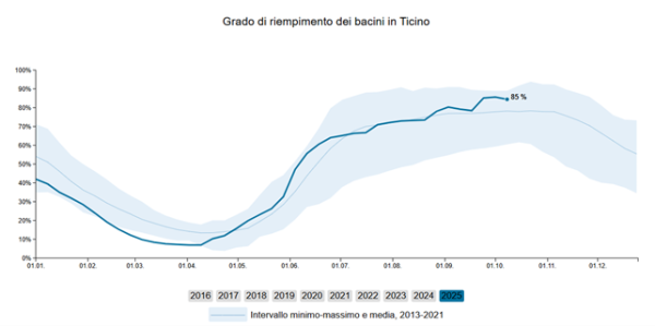 In Italia il dato del riempimento in dettaglio non disponibile, a differenza della Svizzera che lo pubblica, con aggiornamento settimanale e suddiviso per bacini, a questo link: