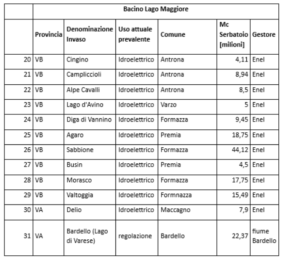 Ne emerge una capacità nominale di circa 165 milioni di m3 posta in territorio italiano a monte del lago Maggiore, a questa capacità deve essere aggiunta la capacità di invaso presente nel territorio elvetico qui non computata.