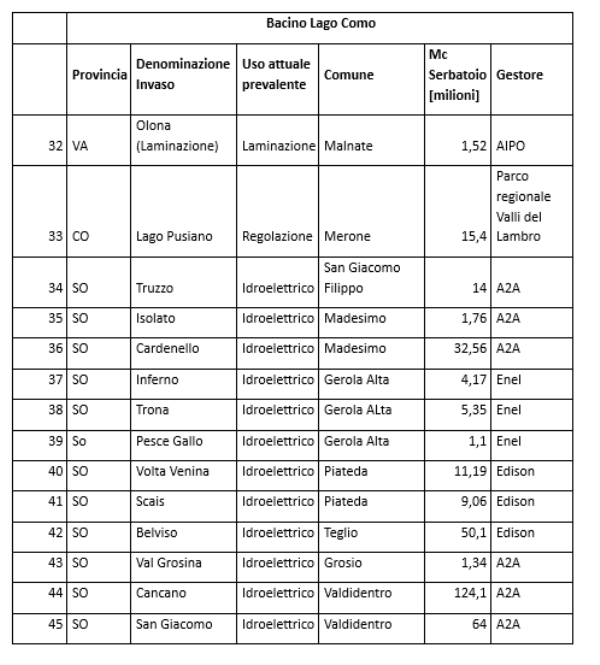 Ne emerge una capacità nominale di circa 335 milioni di m3 posta a monte del lago di Como.