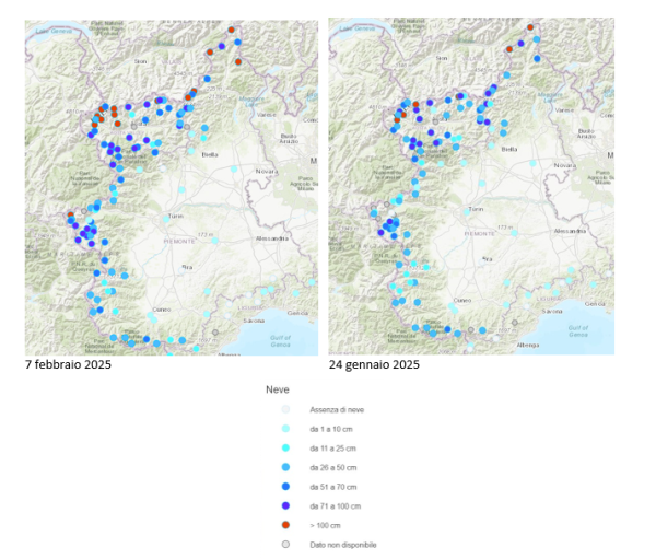 Nelle ultime due settimane si è avuto un aumento dell’accumulo nevoso come emerge dal confronto delle altezze sulle Alpi occidentali al 7 febbraio rispetto al 24 gennaio.
