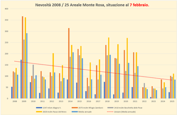 L’analisi delle riserve nevose delle 4 stazioni nivometriche posizionate nell’intorno del Monte Rosa evidenzia la presenza di un accumulo, allo stato, in leggera ripresa pur mantenendosi tendenzialmente basso.