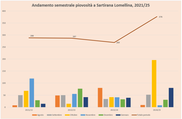 Si riporta l’andamento pluviometrico degli ultimi sei mesi (agosto - gennaio) dell’ultimo quadriennio a Sartirana Lomellina. Il dato semestrale è il più alto degli ultimi 4 anni in forza delle piogge di ottobre, il dato dell’ultimo trimestre è invece il più basso dell’ultimo quadriennio.