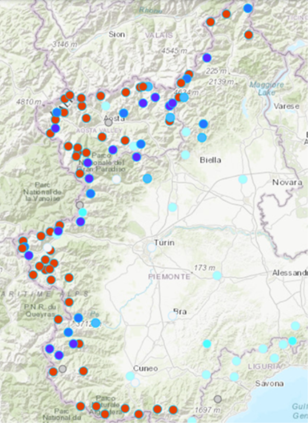 La concentrazione degli accumuli superiori al metro (punti rossi) si concentrata soprattutto sulle Alpi Marittime, Cozie e Graie.