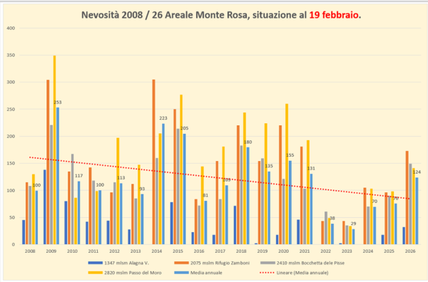 L’analisi delle riserve nevose delle 4 stazioni nivometriche posizionate nell’intorno del Monte Rosa evidenzia accumuli in ripresa ma lontani dai picchi del 2014 o del 2009.
