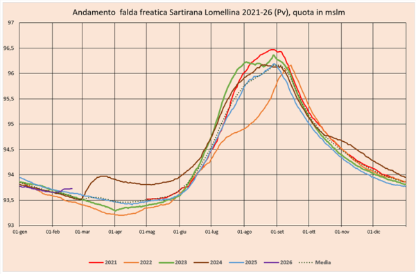 La falda freatica ha invertito la fase di calo è sta segnando un recupero che, pur se debole, appare significativo. Questo miglioramento è dovuto alla diffusa, reiterata ma poco intensa piovosità dei mesi di dicembre, gennaio e febbraio. La percolazione delle cumulate ha determinato il recupero a cui si sta assistendo. Pur se in scala ridotta, e con dinamica temporale anticipata di circa 40 giorni, si sta assistendo ad un comportamento simile a quello del 2024. In passato un simile contributo era garantito dallo scioglimento delle nevicate in pianura.
