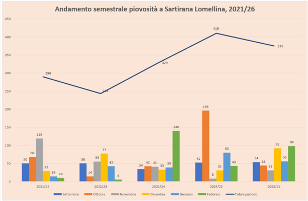 Si riporta l’andamento pluviometrico nell’ultimo semestre, riferito al periodo 2022/26, rilevato a Sartirana Lomellina. Il grafico evidenzia la piovosità importante degli ultimi 3 mesi che ha determinato il recupero della falda freatica.