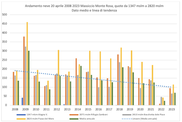 L’analisi delle riserve nevose, dal punto di vista statistico, si concentra sulla porzione di alpi Pennine, nell’intorno del Monte Rosa, dato quanto mai significativo per le riserve utili alla frazione occidentale di pianura irrigua lombarda, pur trattandosi di accumuli piemontesi. La complessità del sistema idraulico nord occidentale vive in un equilibrio assai più complesso delle sempre più accese polemiche di queste settimane: ribadiamo una volta ancora che la risorsa irrigua non conosce né confini amministrativi né primogeniture, ma ha un suo naturale deflusso nell’ambito di bacini idrografici omogenei, come il bacino del Po, dove l’attività antropica, al di là di estemporanee appartenenze territoriali, svolge un ruolo di armonizzazione e governo anche in condizioni di scarsità.