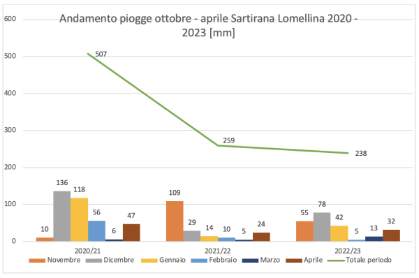 Con riferimento poi alla stazione di misura di Sartirana Lomellina si riporta anche l’andamento pluviometrico delle ultime tre stagioni.