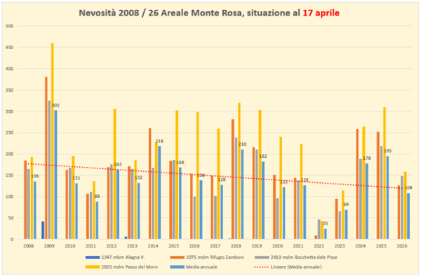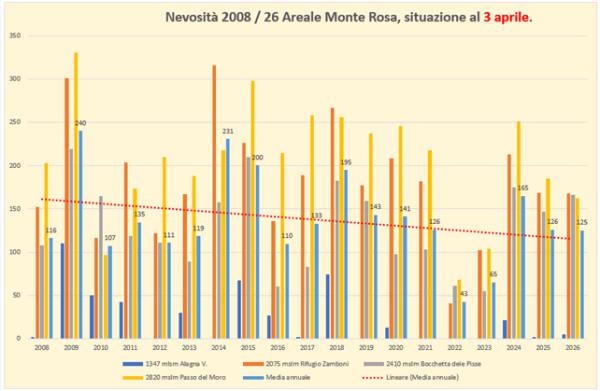 L’analisi delle riserve nevose delle 4 stazioni nivometriche posizionate nell’intorno del Monte Rosa evidenziano la compromissione di una consistente parte degli accumuli nevosi formatisi con le precipitazioni di marzo, passando da un dato sopra media al 19 marzo 2026 ad un dato sotto media in questa analisi. Questa compromissione evidenzia l’incidenza dell’accelerazione dell’innalzamento termico.
