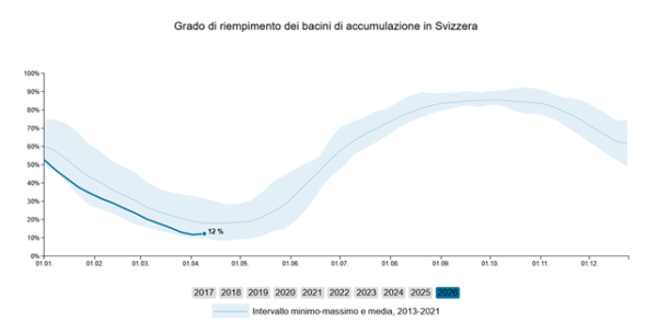 Il lago Maggiore presenta un buon riempimento, prossimo ai massimi di regolazione; situazione sicuramente più complessa la si riscontra nei serbatoi idroelettrici elvetici del bacino del Ticino dove il riempimento si sta ricostituendo a rilento nonostante lo scioglimento nivale, e la percentuale di riempimento è prossima ai minimi assoluti.