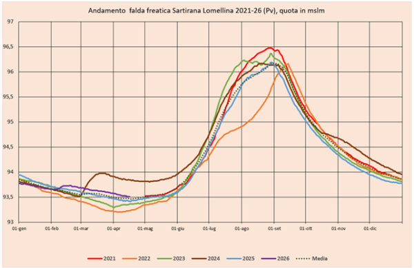 La falda freatica presenta un andamento ancora in calo ma il beneficio portato dalle piogge di gennaio e febbraio ha permesso di riportare in media l’andamento recuperando le difficoltà di fine 2025.