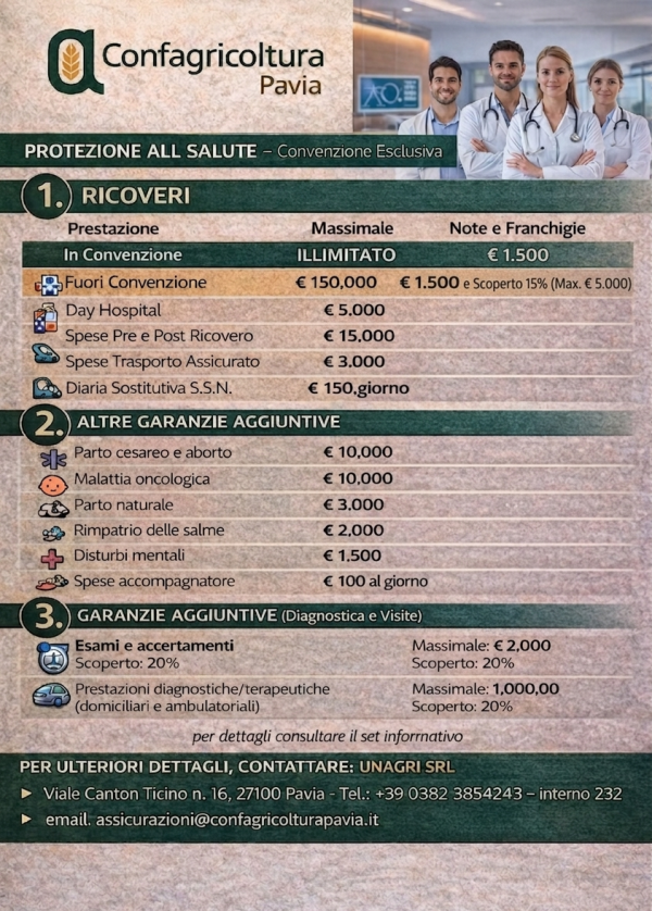 siamo lieti di presentarvi la nuova convenzione "Protezione alla Salute", un pacchetto assicurativo esclusivo studiato per garantire a voi e alle vostre famiglie la massima serenità. La promozione, valida per l'intero anno, offre coperture complete che spaziano dai ricoveri (con massimali illimitati in convenzione) alle visite diagnostiche.
